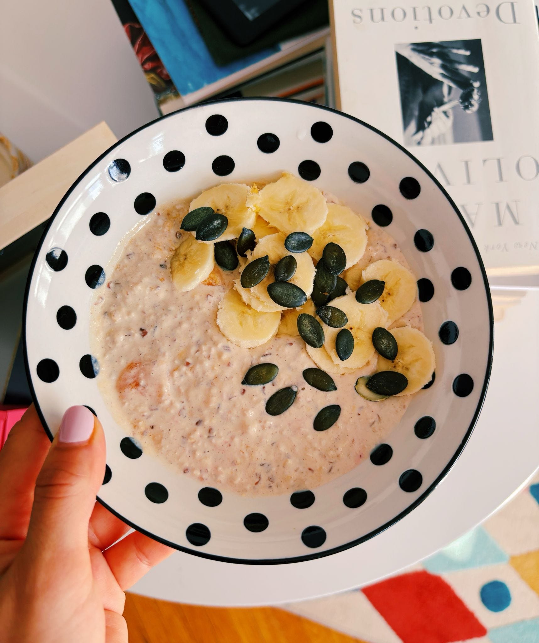 Dimineața, borcanul mă așteaptă deja gata. Tai o jumătate de banană deasupra — un plus de prebiotice — adaug un pumn de fructe de pădure, fie ele proaspete sau din congelator și o linguriță de unt de migdale.